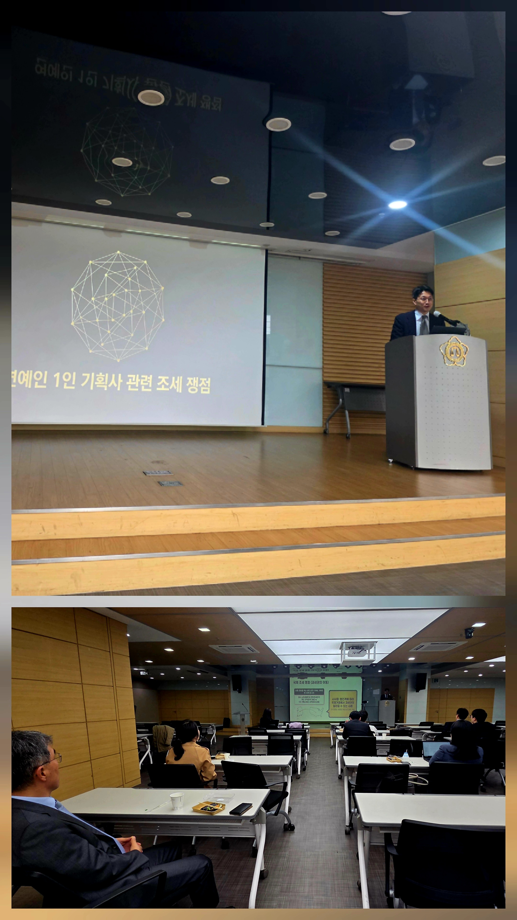 1세션에서는 법무법인 율촌의 유관동 변호사가 “채권추심 및 전부명령과 관련한 실무상 쟁점” 을, 2세션에서는 김ㆍ 장 법률사무소의 심지섭 변호사가 "조세 관련 실무상 쟁점 - 연예인1인 기획사 관련 조세 쟁점"을 주제로 발표를 진행하였다.