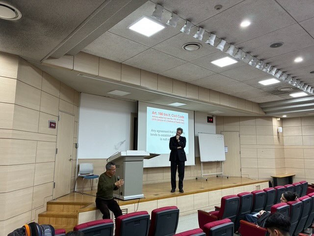 밀라노 대학교 법학과 로렌조 걀리아르디 교수는 우리 로스쿨을 방문하여 김기창 교수의 강의시간에 학생들을 대상으로 "The Roman Law of Family and Property"라는 제목을 강의하였다. 강의 도중 김기창 교수와 로렌조 걀리아르드 교수 사이의 토론이 인상적이었다.